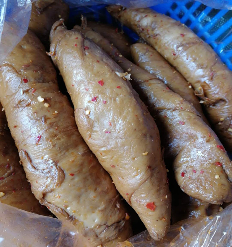 铜陵大通镇有一种风味独特的传统风味食品——大通茶干,闻起来有一丝淡淡的清香,沁人心脾,外皮是深紫黑色,掰开后,里面是浅褐色,很结实,嚼起来很有咬劲,越嚼越香,铜陵人爱吃茶干,不论是当早茶点心,还是切成丝配着炒菜,都让人百吃不厌。