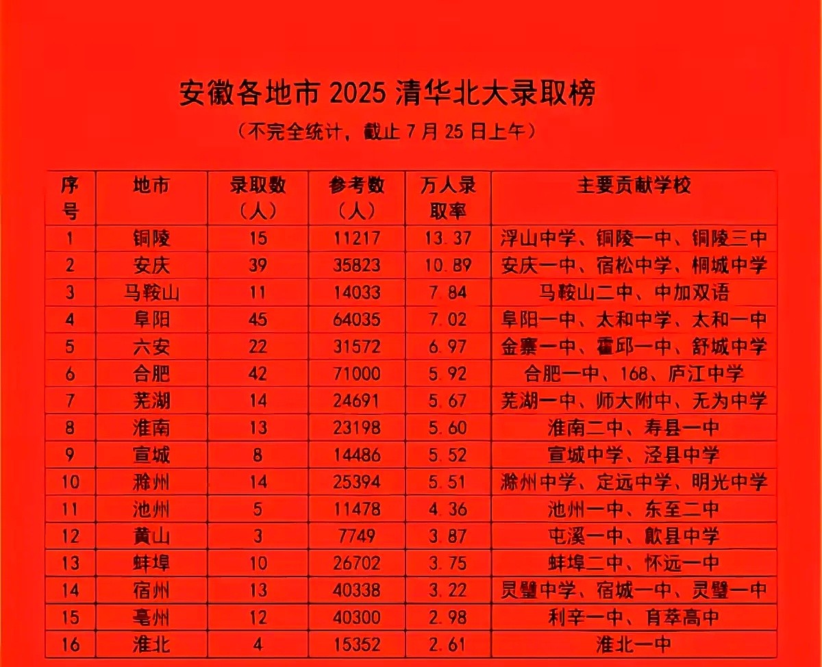 北京知春路15个铜陵娃今年冲进清北,数据摆在这儿:铜陵每万人清北录取率全省第一。