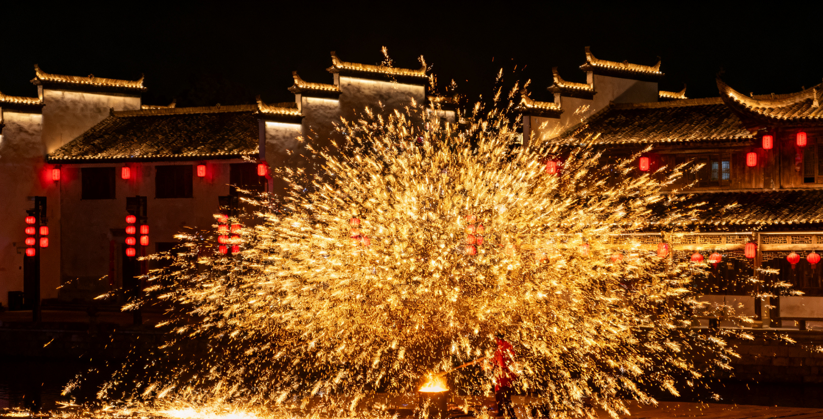 3. 犁桥水镇夜景:站在石桥拍灯笼倒影,打铁花表演用慢门捕捉火花轨迹。