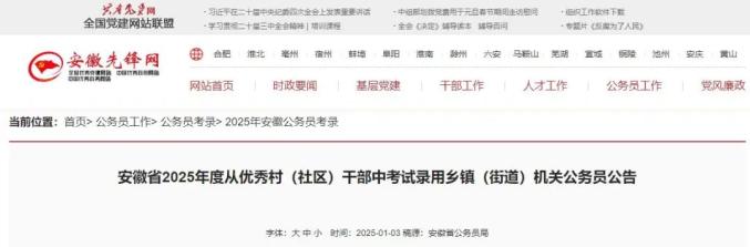 根据中央关于开展从优秀村(社区)干部中考试录用乡镇(街道)机关公务员工作有关精神和公务员录用有关规定,安徽省公务员局决定,组织实施全省2025年度从优秀村(社区)干部中考试录用乡镇(街道)机关公务员工作。现将有关事项公告如下: